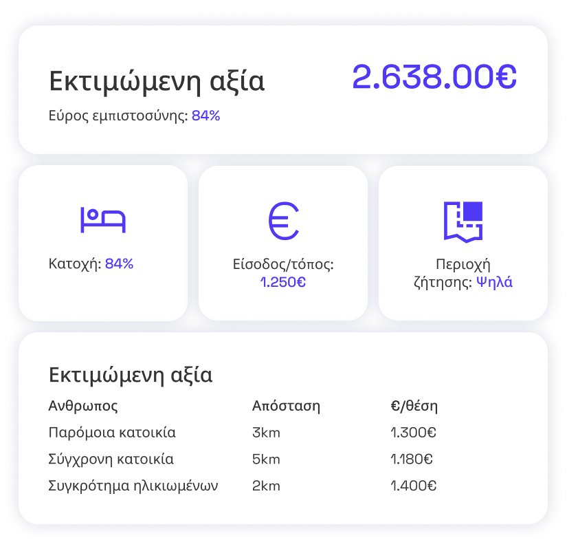 Το εργαλείο μας αναλύει βασικούς δείκτες του τομέα φροντίδας και φιλοξενίας ώστε να παρέχει εκτίμηση ευθυγραμμισμένη με τις πραγματικές συνθήκες της αγοράς.