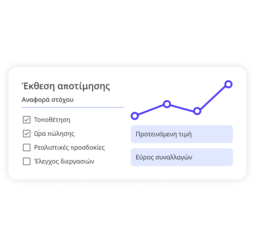 Ξεκινήστε με μια ενδεικτική αποτίμηση και λάβετε στρατηγικές αποφάσεις βασισμένες σε πραγματικά δεδομένα αγοράς.